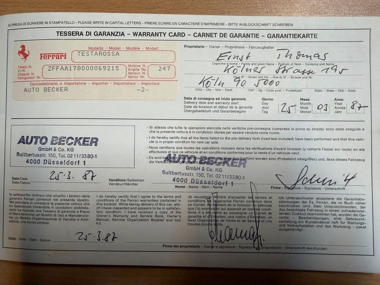 Ferrari Testarossa, Modell 1987, deutsche Auslieferung Auto-Becker-Düsseldorf,