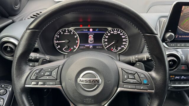 6 Lautsprecher, Abdeckkappen Außenspiegel Schwarz, Airbag Beifahrerseite abschaltbar, Airbag Fahrer-/Beifahrerseite und Seitenairbag vorn, Ambiente-Beleuchtung, Audiosystem: Radio, Ausstattungs-Paket: Nissan Connect, Außenspiegel elektr. verstellbar, Außenspiegel mech. von innen verstellbar, Außentemperaturanzeige, Bremsassistent (Nissan Brake-Assist), Dachantenne im Haifischflossen-Design, Dachhimmel schwarz, Dachspoiler, Einparkhilfe hinten, Fahrassistenz-System: Aktive Fahrkomfortregelung (Fahrwerksdämpfung), Fahrassistenz-System: aktiver Spurhalteassistent, mit korrigierendem Bremseingriff, Fahrassistenz-System: Autonomer Notbrems-Assistent, Fahrassistenz-System: Berganfahr-Assistent, Fahrassistenz-System: Fernlichtassistent, Fahrassistenz-System: Kurvenbremskontrolle (Aktive Spurkontrolle), Fahrassistenz-System: Sicherheitssystem ERA GLONASS mit automatischem Notruf, Fahrassistenz-System: Verkehrszeichenerkennung, Fahrer-Informations-System (FIS) mit Farbdisplay, Fahrmodusschalter, Fensterheber elektrisch vorn + hinten, Gepäckraumabdeckung / Rollo, Geschwindigkeits-Begrenzeranlage, Getriebe 7-Gang - Doppelkupplungsgetriebe DCT, Isofix-Aufnahmen für Kindersitz, Karosserie: 5-türig, Kopf-Airbag-System, Kopfstützen vorn und hinten verstellbar, Lenksäule (Lenkrad) höhenverstellbar, Leseleuchte vorn, LM-Felgen, Motor 1, 0 Ltr. - 86 kW 12V KAT, Nebelscheinwerfer LED, Parkbremse elektrisch, Radioempfang digital (DAB+), Radstand 2636 mm, Reifen-Reparaturset, Reifendruck-Kontrollsystem, Rückfahrkamera, Rücksitz geteilt/klappbar, Schadstoffarm nach Abgasnorm Euro 6d-TEMP, Service-System: Nissan Connect Services, Sitz vorn links höhenverstellbar, Sitzbezug / Polsterung: Stoff, Smartphone Schnittstelle (Apple CarPlay & Android Auto), Sonnenblenden mit Spiegel (beleuchtet), Sportsitze vorn (Monoform-Design), Sprachbediensystem Spracherkennung, Start-Stop-Knopf, Start/Stop-Anlage, Steckdose (12V-Anschluß), Türgriffe innen verchromt, Türverkleidung Kunstleder, Verglasung hinten abgedunkelt