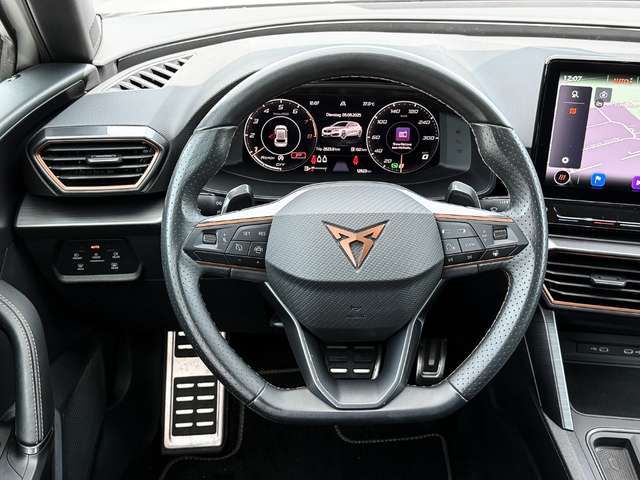 • Weiteres: Antriebs-Schlupfregelung (ASR), Isofix-Aufnahmen für Kindersitz an Rücksitz, Rücksitzlehne geteilt/klappbar (1/3-2/3), Einparkhilfe hinten, Parkbremse elektrisch, Lendenwirbelstütze Sitz vorn rechts, verstellbar, Leuchtweitenregelung automatisch, Notrufsystem, Reserverad als Notrad, Getriebe 7-Gang - Doppelkupplungsgetriebe DSG, Geschwindigkeits-Regelanlage (Tempomat) inkl. Geschw.-Begrenzer, Differentialsperre (Vorderachse), Sitzbezug / Polsterung: Stoff, USB-Schnittstelle vorn (2-fach, Typ C), Fensterheber elektrisch vorn + hinten mit Komfortschaltung, Kombiinstrument digital (virtual cockpit), Nebelscheinwerfer LED mit Abbiegelicht, Schadstoffarm nach Abgasnorm Euro 6d, Seitenairbag vorn mitte (Central Airbag), LM-Felgen, Zentralverriegelung / Startanlage Keyless Go (Start-Stop-Knopf), Lenkrad heizbar (Sport/Leder) mit Multifunktion und Schaltfunktion, Seitenscheiben hinten und Heckscheibe abgedunkelt, Außenspiegel elektr. verstell-, heiz- und anklappbar mit Spiegelabsenkung und Welcome Light, Lichtassistent (Coming Home, Leaving Home), PROGRESSIVLENKUNG, Audio-Navigationssystem mit Touchscreen Farbbildschirm, Scheinwerfer Voll-LED, Schließ-/Startsystem Kessy Advanced, Anti-Blockier-System (ABS), Kopf-Airbag-System, Reifenkontroll-Anzeige, Seitenairbag, Wegfahrsperre (elektronisch), Licht- und Regensensor, Airbag Fahrer-/Beifahrerseite, Mittelkonsole vorn mit Mittelarmlehne, Becherhalter, Ablagebox und Luftausströmer hinten, Gepäckraumabdeckung / Rollo, Heckleuchten Voll-LED mit dynamischem Lichtband (Infinite Light), Tagfahrlicht LED, USB-Ladeanschlüsse (2-fach, Typ C) für 2.Sitzreihe, Heckleuchten LED mit dynamischem Blinklicht, Adaptive Fahrwerksregelung (DCC), Beifahrerairbag abschaltbar, Blinkleuchten LED in Außenspiegel integriert, Climatronic 3-Zonen, Dynamic-Paket, Einstiegsleisten (Aluminium) vorn, beleuchtet, Elektron. Stabilitätskontrolle (ESC), Fahrprofilauswahl (CUPRA Drive Profile), Innenspiegel mit Abblendautomatik, Lendenwirbelstütze, Licht- und Sicht-Paket, Müdigkeitserkennung, Radioempfang digital (DAB+), Servolenkung elektro-mechanisch, Sitzhöhenverstellung, Sitzhöhenverstellung Fahrersitz, Sport-Schalensitze vorn, Sprachsteuerung, Spurhalteassistent, Start/Stop-Anlage, Umfeldbeobachtungssystem (Front assist) mit City-Notbremsfunktion, Uni-Lackierung, Wärmeschutzverglasung