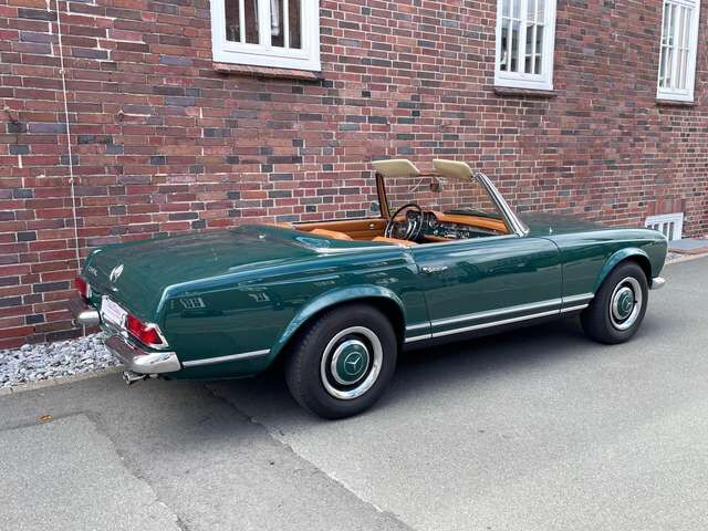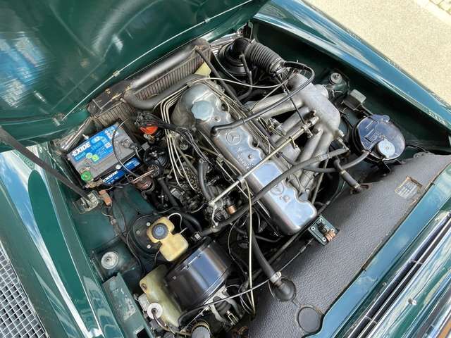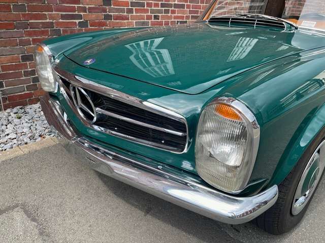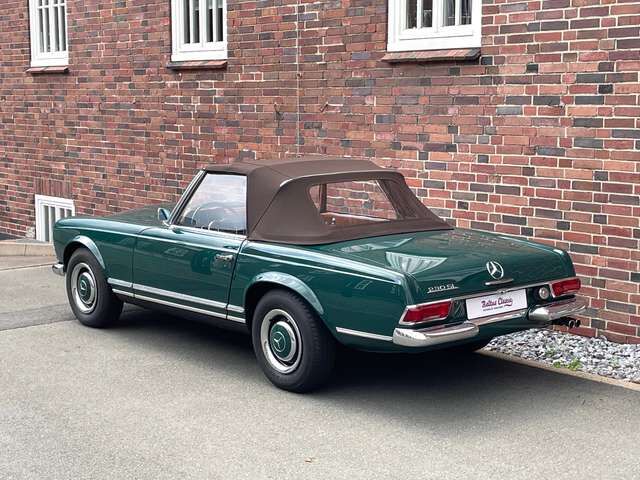? Der Zustand der Pagode ist gut und tatsächlich noch relativ original, bis auf normale Reparaturen der Jahre, ein paar ersetzte Bleche und eine Lackierung in der originalen Farbe. 2018 hat die Pagode ein neues Verdeck bekommen, natürlich eines in guter Qualität aus Sonnenland Verdeckstoff. Außerdem wurde ein komplett neuer Teppichsatz verbaut.