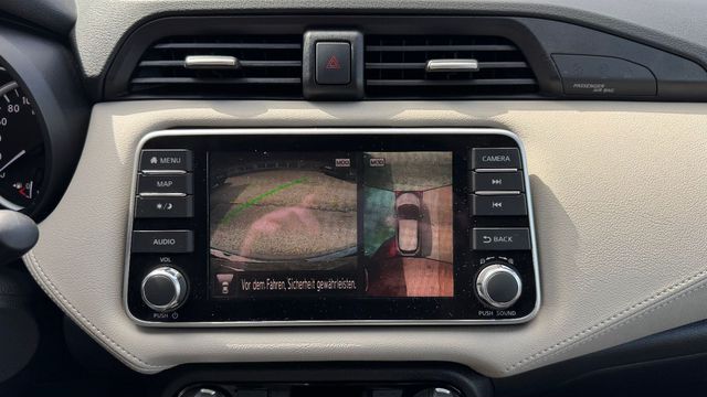 3. Bremsleuchte, 6 Lautsprecher, Airbag Beifahrerseite abschaltbar, Airbag Fahrer-/Beifahrerseite und Seitenairbag vorn, Ambiente-Beleuchtung, Around View Monitor (360 Umgebungsansicht), Audio-Paket, Audiobedienung am Lenkrad, Audiosystem: Radio mit CD-Player inkl. MP3-Wiedergabefunktion, Automatische Fahrlichtschaltung, AUX-IN-Anschluss (AUX-IN), Außenspiegel elektr. verstellbar, Außenspiegel Wagenfarbe, Außentemperaturanzeige, Bluetooth-Schnittstelle, Bordcomputer, Bose-Audiosystem, Bremsassistent (Nissan Brake-Assist), Comfort-Paket, Dachantenne, Dachspoiler, Design-Paket, Drehzahlmesser, Fahrassistenz-System: Autonomer Notbrems-Assistent, Fahrassistenz-System: Berganfahr-Assistent, Fahrassistenz-System: Fußgängererkennung, Fahrassistenz-System: Notbrems-Assistent, Fahrassistenz-System: Spurhalteassistent, Fahrassistenz-System: Verkehrszeichenerkennung, Frontscheibe Verbundglas, Gepäckraumabdeckung / Rollo, Geschwindigkeits-Begrenzeranlage, Getränkehalter hinten, Getränkehalter vorn, Gurtstraffer, Heckscheibe heizbar, Heckscheibenwischer, Innenspiegel mit Abblendautomatik, Isofix-Aufnahmen für Kindersitz, Karosserie: 5-türig, Klimaautomatik, Kopf-Airbag-System, Kopfstützen vorn und hinten verstellbar, Lenkrad (Sport/Leder), Lenksäule (Lenkrad) höhen-/längsverstellbar, Leseleuchte vorn, Leuchtweitenregelung automatisch, Motor 1, 0 Ltr. - 68 kW 12V KAT, Navigationssystem Nissan Connect, Nebelscheinwerfer, Reifen-Reparaturset, Reifendruck-Kontrollsystem, Rückfahrkamera, Rücksitzbank umklappbar, Schadstoffarm nach Abgasnorm Euro 6d, Schalt-/Wählhebelgriff Leder, Scheibenwischer mit Regensensor, Sitzheizung vorn, Sitz vorn links höhenverstellbar, Sitzbezug / Polsterung: Stoff, Sonnenblenden mit Spiegel, Start-Stop-Knopf, Start/Stop-Anlage, Steckdose (12V-Anschluß), Technik-Paket, Touchscreen-Farbdisplay (7, 0 Zoll) in Mittelkonsole, Türgriffe innen verchromt, Türverkleidung mit Stoffeinsatz, USB-Schnittstelle