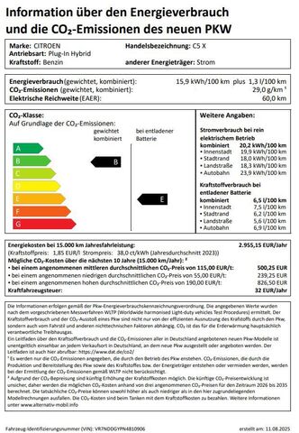 CO2-Effizienzklasse: Fuel consumption combined:: l/100km urban:: l/100km extra-urban:: l/100km CO2-Emissions combined (g/km): g/km Emission class: Euro 6D Particle filter: nein Umweltplakette:green  Emissionsärmster Kraftstoff: |