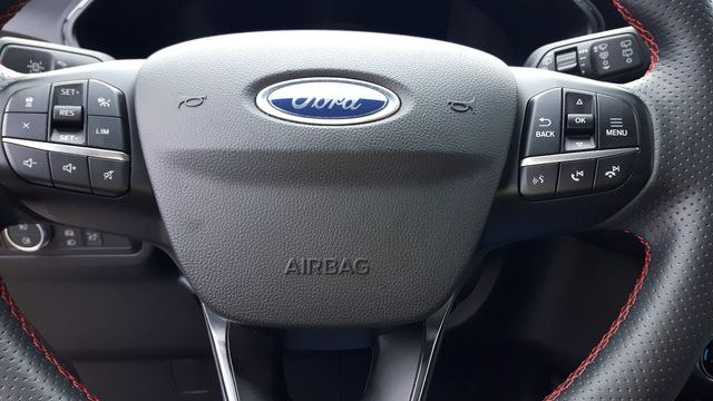 Ambiente-Beleuchtung vorn (LED), Antischlupfregelung (ASR), Audio-Navigationssystem Ford mit AppLink, Außenspiegel elektr. anklappbar, Außenspiegel elektr. verstell- und heizbar, Body-Styling-Paket, Bordcomputer, Brillenfach in Dachhimmel / Dachkonsole integriert, Dachhimmel Stoff, dunkel, Dachreling schwarz, Dachspoiler Wagenfarbe, Doppelendrohr Auspuffanlage, Eco-Anzeige für verbrauchsoptimiertes Fahren (EcoCoach), Fahrassistenz-System: Notbrems-Assistent, Fahrassistenz-System: Post-Collision-System, Fahrassistenz-System: Pre-Collision-System, Fahrassistenz-System: Spurhalteassistent, Fensterheber elektrisch vorn + hinten mit Komfortschließung, FordPass Connect inkl. eCall, Gepäckraumabdeckung / Rollo, Heckleuchten LED, Induktionsladeschale für mobile Endgeräte, Innenspiegel mit Abblendautomatik, Intelligent Protection System (IPS), Isofix-Aufnahmen für Kindersitz, Karosserie: 5-türig, Kindersicherung elektrisch, Klimaautomatik 2-Zonen, Kombiinstrument Digitalanzeige 12, 3 Zoll, Kopfstützen vorn 4-fach verstellbar, Lenkrad (Sport/Leder, ST), Lenksäule (Lenkrad) höhen-/längsverstellbar, Mittelarmlehne hinten, Motor 1, 5 Ltr. - 110 kW EcoBoost KAT (1496 ccm), My Key (2. Fahrzeugschlüssel programmierbar), Parkbremse elektrisch mit Auto-Hold-Funktion, Parkpilotsystem vorn und hinten, Pedale Aluminium, Radstand 2710 mm, Reifen-Reparaturkit, Reifendruck-Kontrollsystem, Rücksitzlehne geteilt, Rücksitzlehne klappbar, Schadstoffarm nach Abgasnorm Euro 6d-TEMP, Schalt-/Wählhebelgriff Aluminium, Scheibenrahmen schwarz, Scheinwerfer mit Ausschaltverzögerung, Scheinwerfer-Assistent mit Tag-/Nachtsensor, Sitz vorn links elektr. verstellbar (10-fach), Sitz vorn rechts verstellbar (8-fach), Sitzbezug / Polsterung: Kunstleder / Stoff Wildleder Optik, Sitzheizung vorn, Sonnenblende links mit Spiegel (beleuchtet), Sonnenblende rechts mit Spiegel (beleuchtet), Sport-Fahrwerk, Sportsitze, Start/Stop-Anlage, Verglasung hinten abgedunkelt (Privacy Glass),