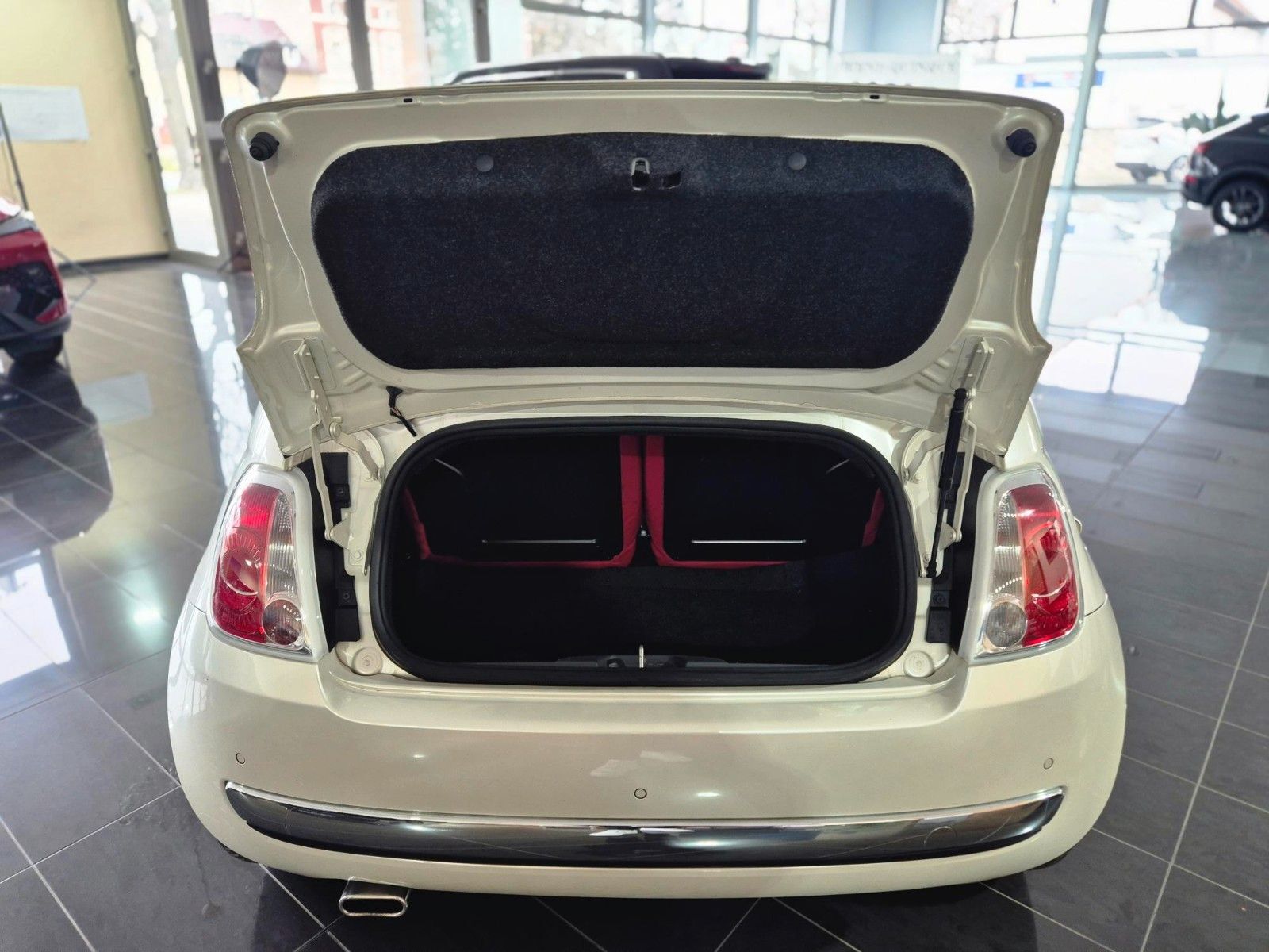 Airbag Fahrer-/Beifahrerseite, Audiosystem: Radio mit CD- und MP3-Player, Außenspiegel elektr. verstell- und heizbar, beide, Außenspiegel Wagenfarbe, Beifahrerairbag abschaltbar, Blue & Me (Bluetooth mit Sprachsteuerung, USB-Schnittstelle, MP3), Bordcomputer, Chrom-Paket, Einparkhilfe elektronisch, Elektr. Bremskraftverteilung, Fahrassistenz-System: Bremsassistent, Faltdach elektrisch, Gurtstraffer vorn, Heckscheibe heizbar, Heckspoiler, Isofix-Aufnahmen für Kindersitz an Rücksitz, Karosserie: 2-türig, Knieairbag Fahrerseite, Kopf-Airbag-System vorn, Kopf-Airbag-System vorn und hinten, Lenksäule (Lenkrad) höhenverstellbar, LM-Felgen, Motor 1, 2 Ltr. - 51 kW KAT, Reifen-Reparaturkit, Rücksitz geteilt / klappbar, Schadstoffarm nach Abgasnorm Euro 5, Seitenairbag vorn, Sitz vorn links höhenverstellbar, Sound-System Interscope, Steckdose (12V-Anschluß) im Armaturenbrett, Steckdose (12V-Anschluß) vorn, Stoßfänger Wagenfarbe, Tankdeckel abschließbar, Tasche an Sitz vorn rechts, Türgriffe außen verchromt, Wärmeschutzverglasung