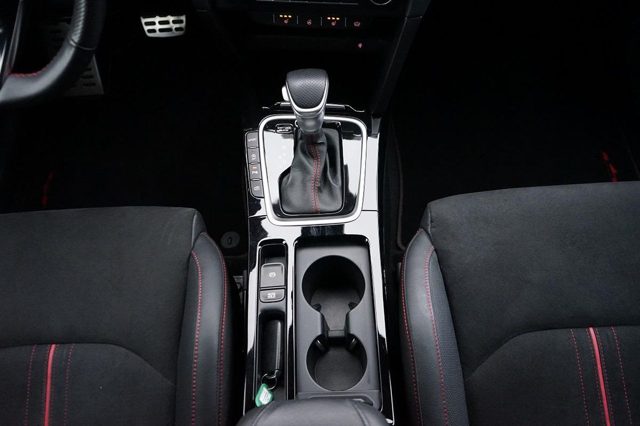 • Sportsitze mit Sitzbezügen in Leder-Veloursleder-kombination: Schwarz mit roter Ziernaht und Stickung GT