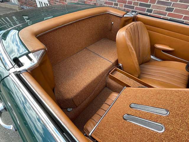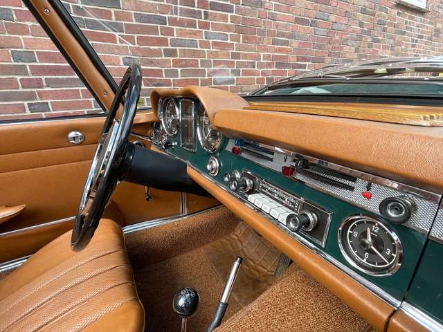? Der Zustand der Pagode ist gut und tatsächlich noch relativ original, bis auf normale Reparaturen der Jahre, ein paar ersetzte Bleche und eine Lackierung in der originalen Farbe. 2018 hat die Pagode ein neues Verdeck bekommen, natürlich eines in guter Qualität aus Sonnenland Verdeckstoff. Außerdem wurde ein komplett neuer Teppichsatz verbaut.