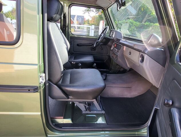 Wir bieten Ihnen hier einen wunderschönen seltenen Mercedes-PUCH 300GD 1/372 aus schweizer Vorbesitz an. In diesem Pflegezustand wird man vergleichbare Fahrzeuge kaum noch finden. In sehr vielen Stunden wurde der 300GD durch uns im Detail aufgearbeitet. In der Kombination Lackierung "Zypressengrün-Metallic" und der Lederfarbe schwarz sehr schön anzusehen. Der Rahmen mit Federaufnahmen und Stoßdämpferaufnahmen präsentiert sich sehr sauber und gewachst. Wir haben zum weiteren Schutz vier Kunststoff-Radhausschalen verbaut. Alle Längslenkerbuchsen der Vorderachse und Hinterachse sind erneuert worden, 4 neue Stoßdämpfer verbaut, Bremsleitungen erneuert, Auspuffanlage teilweise erneuert, Bremsscheiben mit Belägen erneuert, 5 All-Terrain Reifen erneuert, Servicearbeiten inklusive Ventileinstellungen und Wechsel aller Öle in Getrieben, Achsen und Motor sind durchgeführt, Bremsflüssigkeiten erneuert, Leitungen der Differentialsperren gereinigt, und vieles mehr. Der Innenraum verfügt über 4 Sitzplätze (Einzelsitze). Im Laderaum haben wir einen Holzboden anfertigen lassen und eingebaut. Auch der gut erhaltene Stahltank wurde durch uns ausgebaut , gereinigt und mit neuen Fangbändern wieder montiert. Sämtliche Türgummis und Scheibengummis sind durch uns erneuert worden, allein diese Kosten betragen schon fast 4.000 Euro.